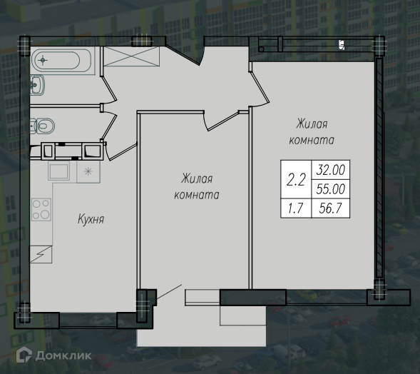 - Общая площадь: 56.7 м²